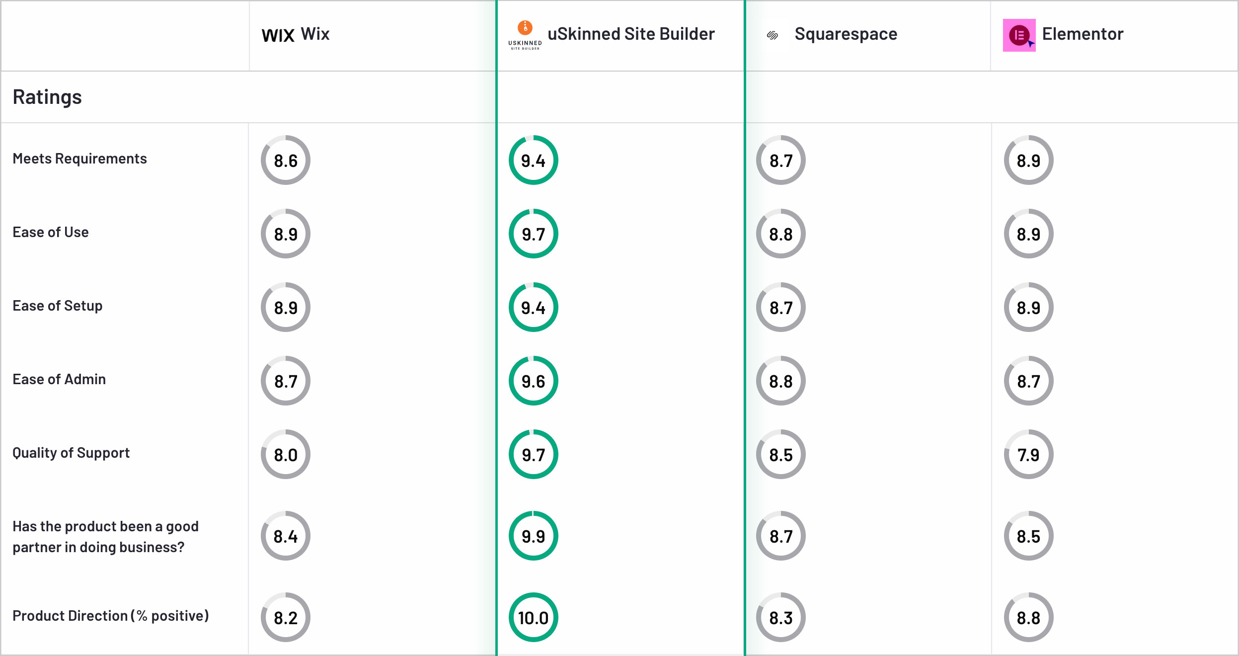 uSkinned Site Builder is rated higher than its competitors, including Elementor, in all categories.