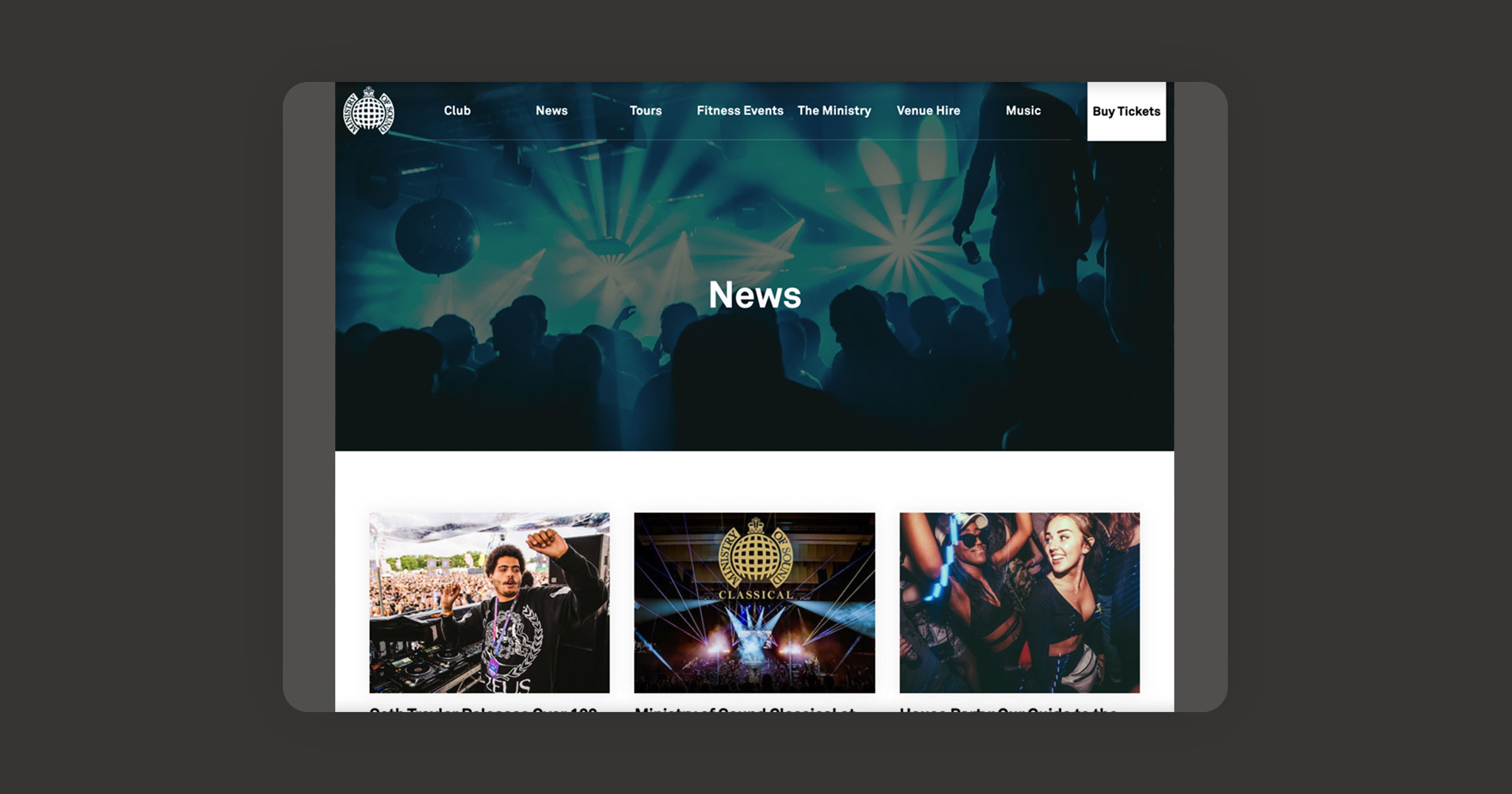 The need to use a solid and consistent foundation across all websites was a must for Ministry of Sound. This ensures that their content teams can quickly create and publish articles and pages on any of the brands' websites without the need to be trained time and time again. Furthermore, a consistent approach makes ongoing project management of the websites even easier and ultimately saves money by reducing development costs and the time spent in the CMS.