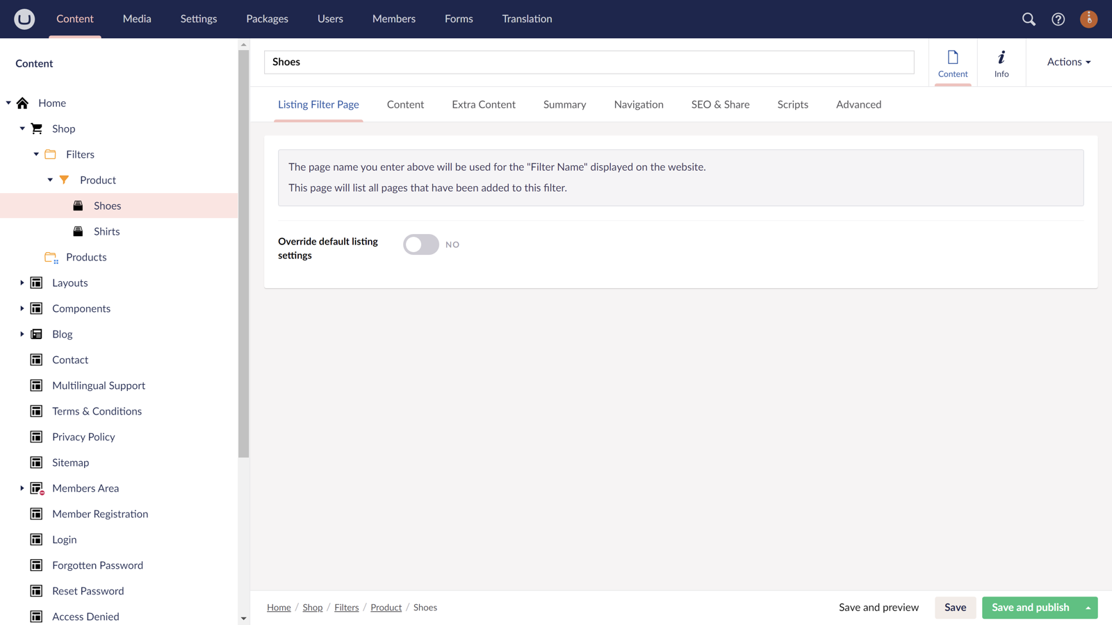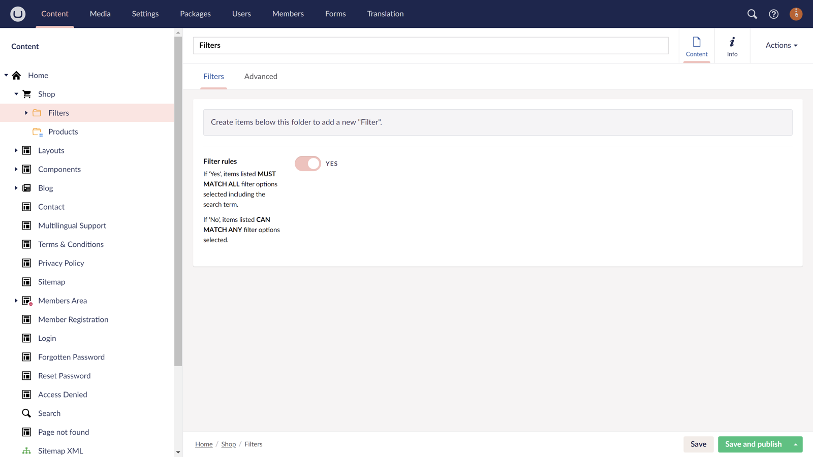 Your Shop node and associated Filters and Products folders have now been automatically generated.