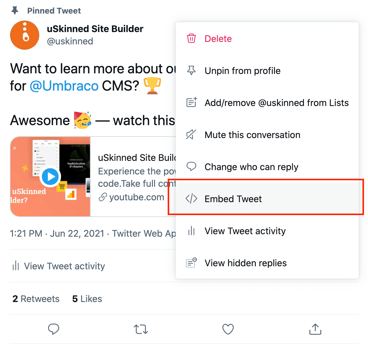 We'll now show you the various ways you can display Twitter posts with uSkinned for Umbraco.
