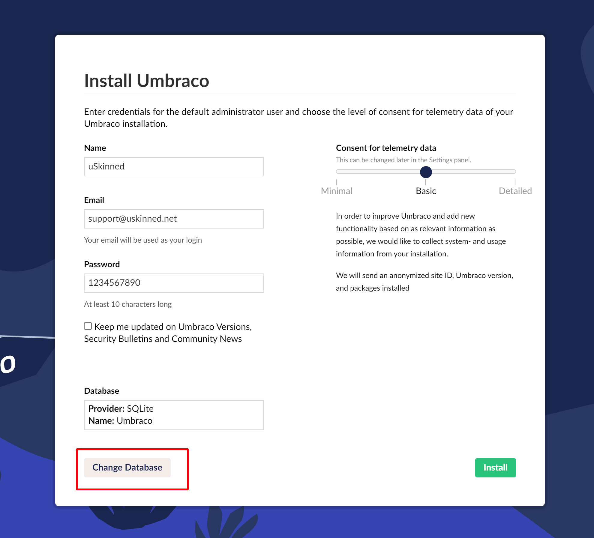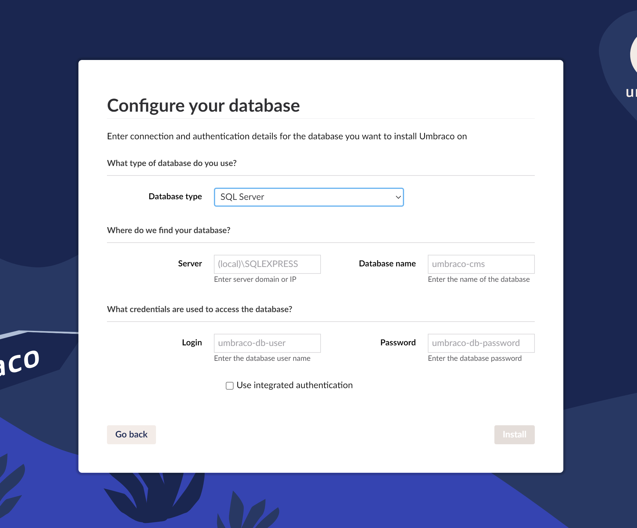 Fill out the Umbraco installation form making sure that you change your database to SQL Server.